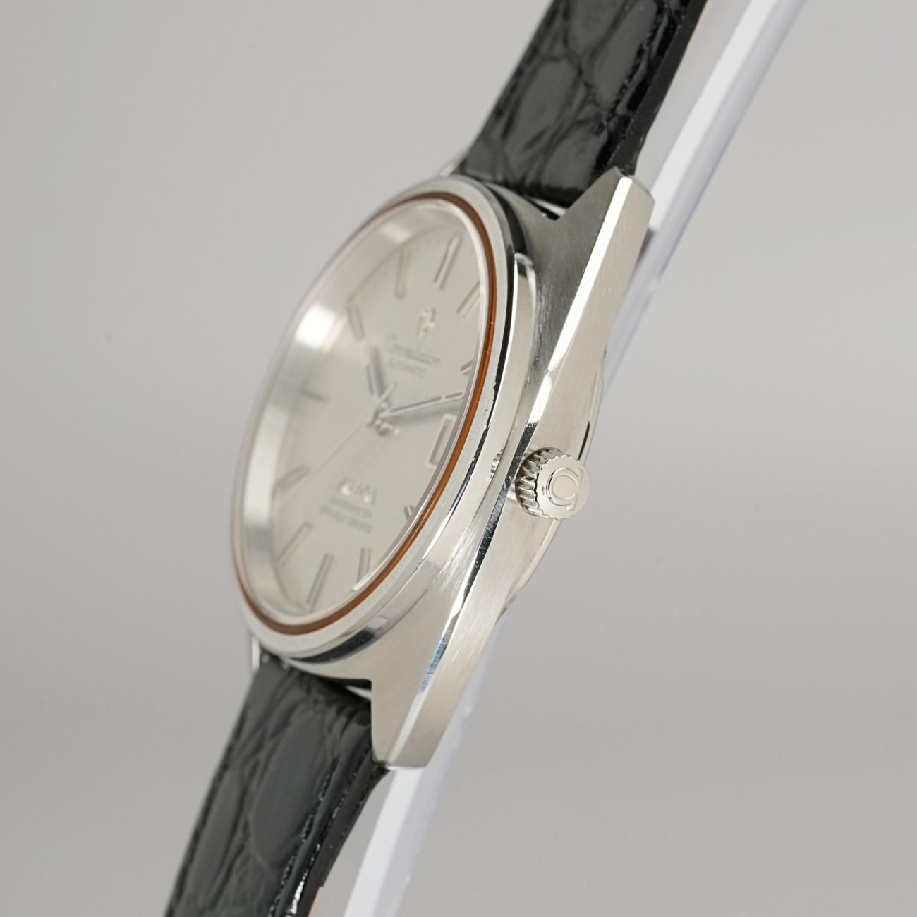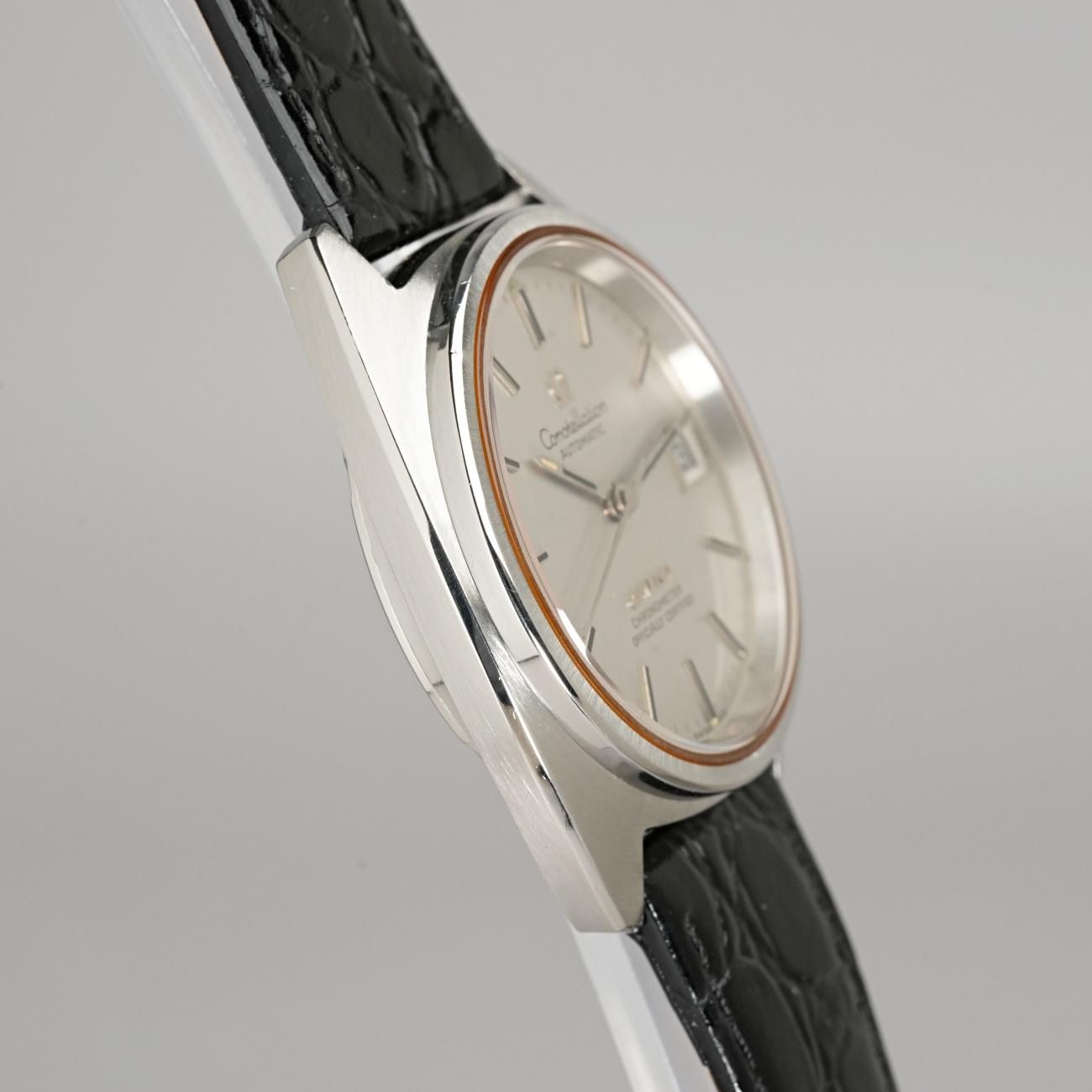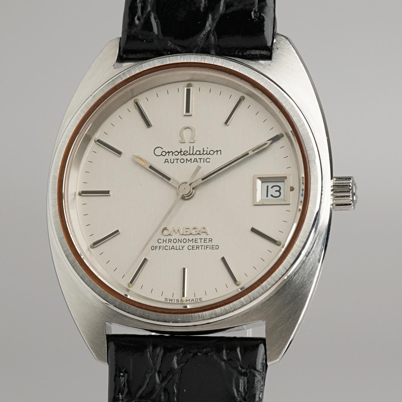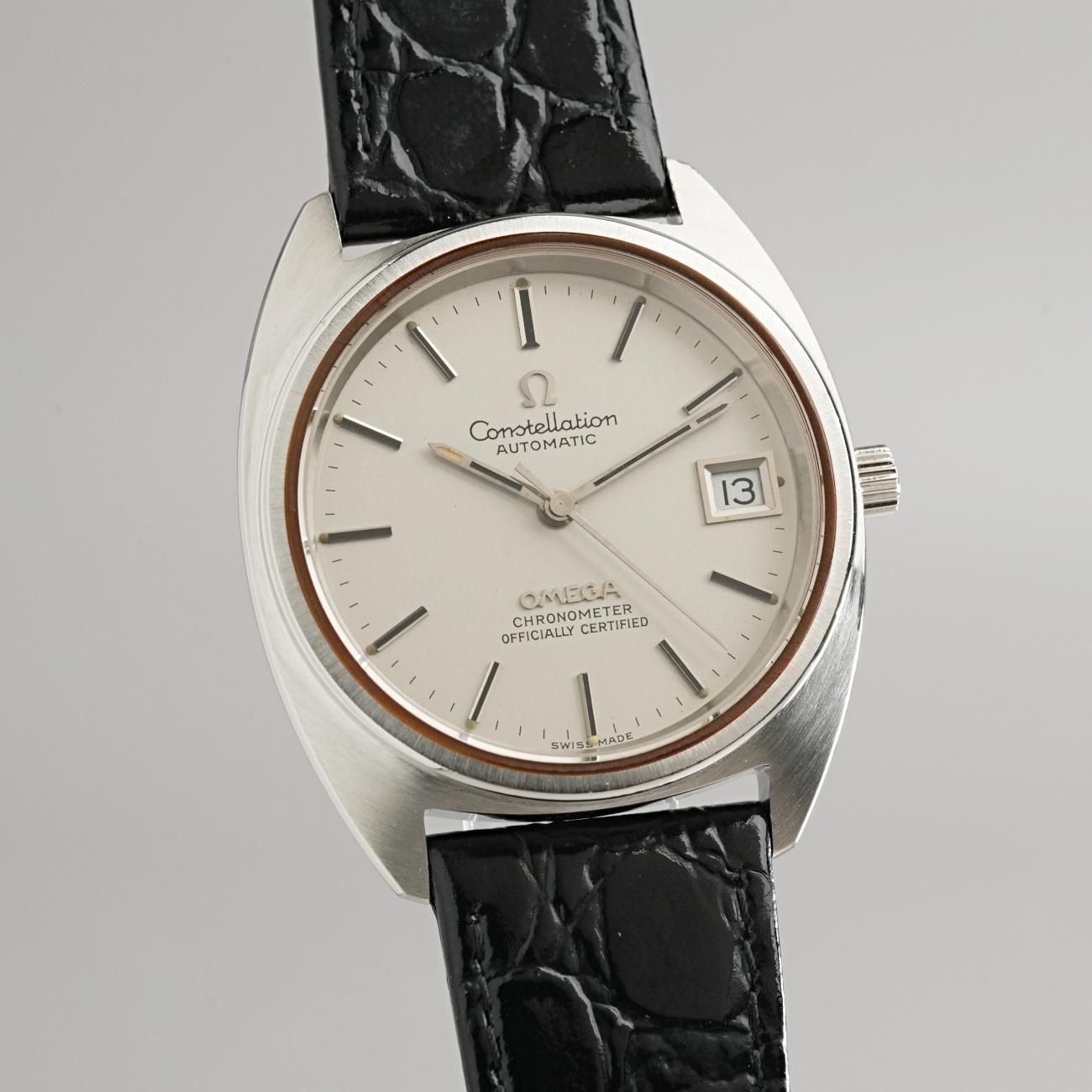 シンプルでお洒落なシルバー文字盤に、アップライトオメガマーク、1970年代前期に製造されたコンステレーション・デイトで、5姿勢で調整済みのクロノメータ規格に適合したキャリバー1011を搭載している高級モデルです。