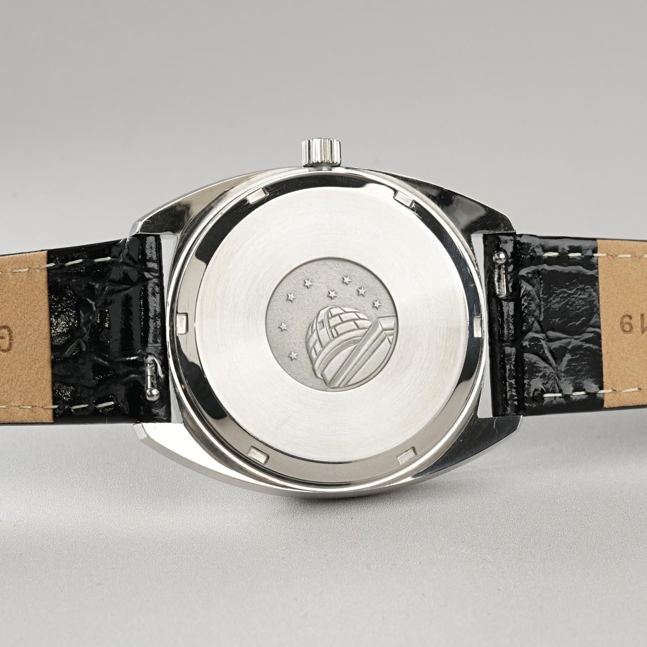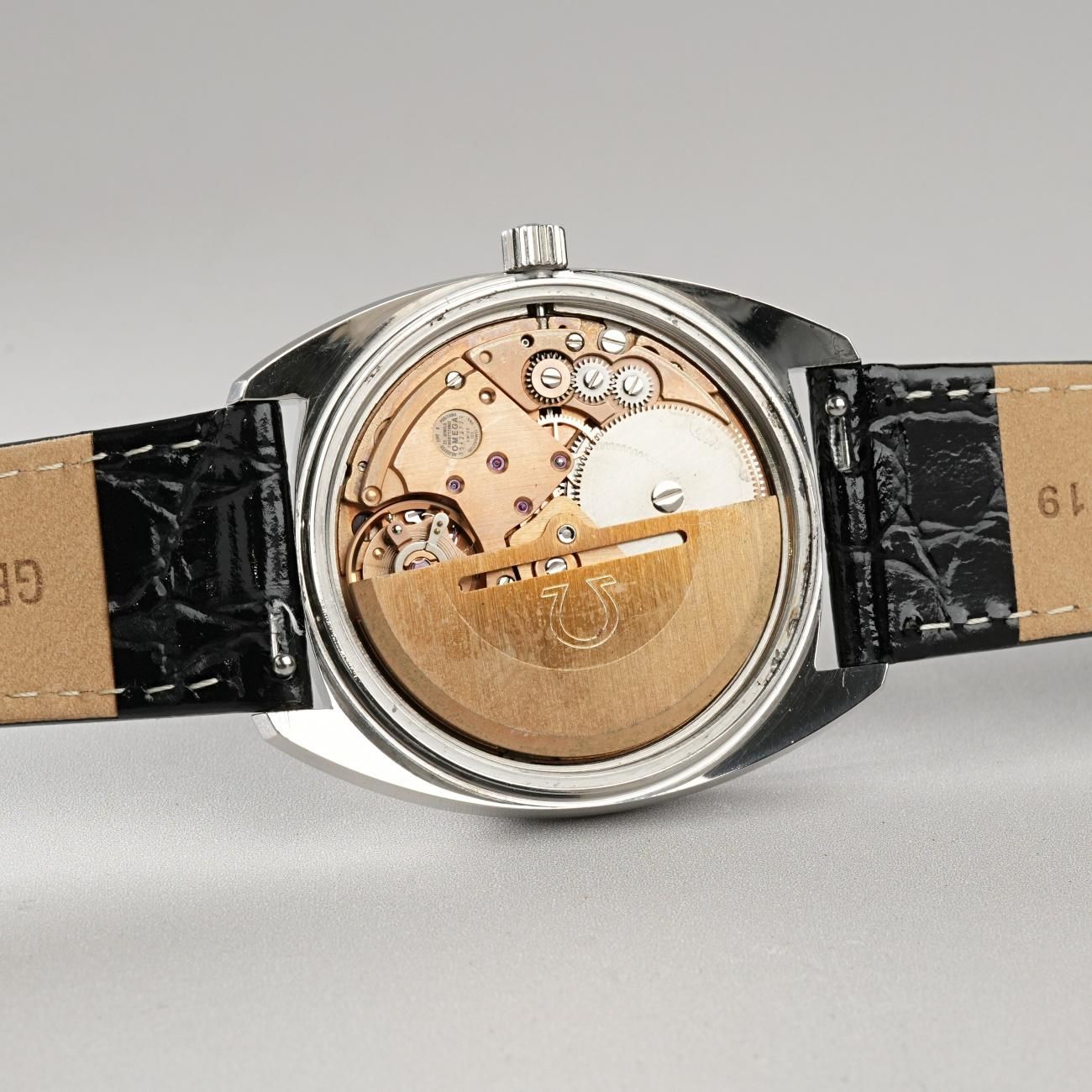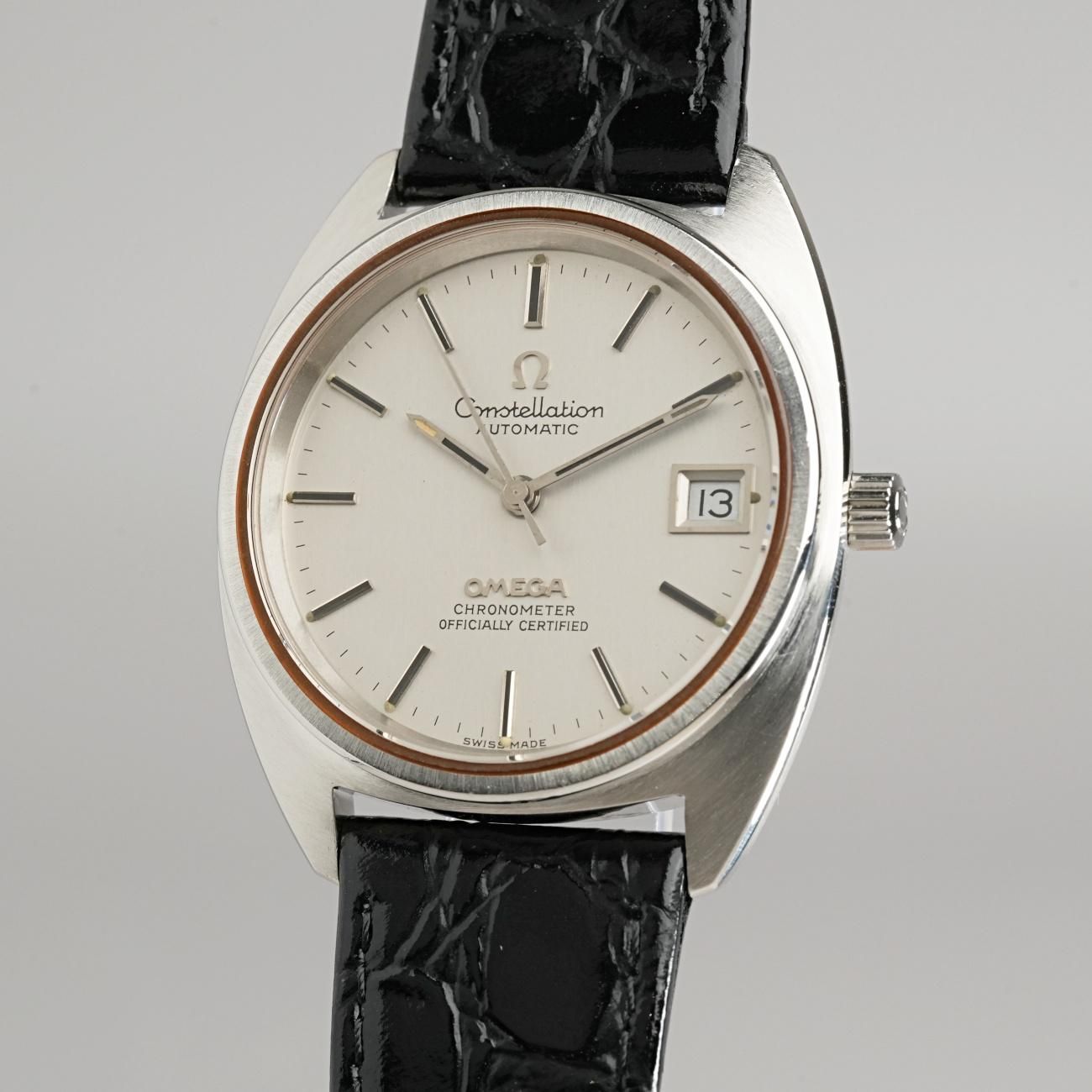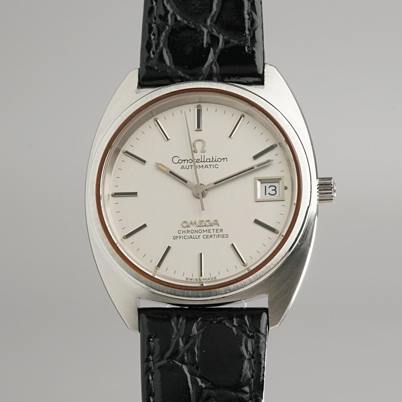 シンプルでお洒落なシルバー文字盤に、アップライトオメガマーク、1970年代前期に製造されたコンステレーション・デイトで、5姿勢で調整済みのクロノメータ規格に適合したキャリバー1011を搭載している高級モデルです。