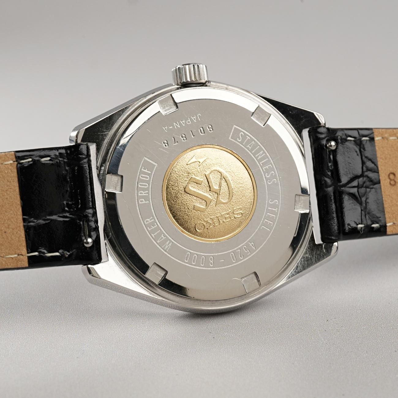 ケースの「8000」番は代表的な「GSデザイン」で、服部時計店初の大卒デザイナーであった田中太郎氏が手掛けた「セイコースタイル」といわれる時計デザインの方程式を最も具現化したのがこのケースといわれています。