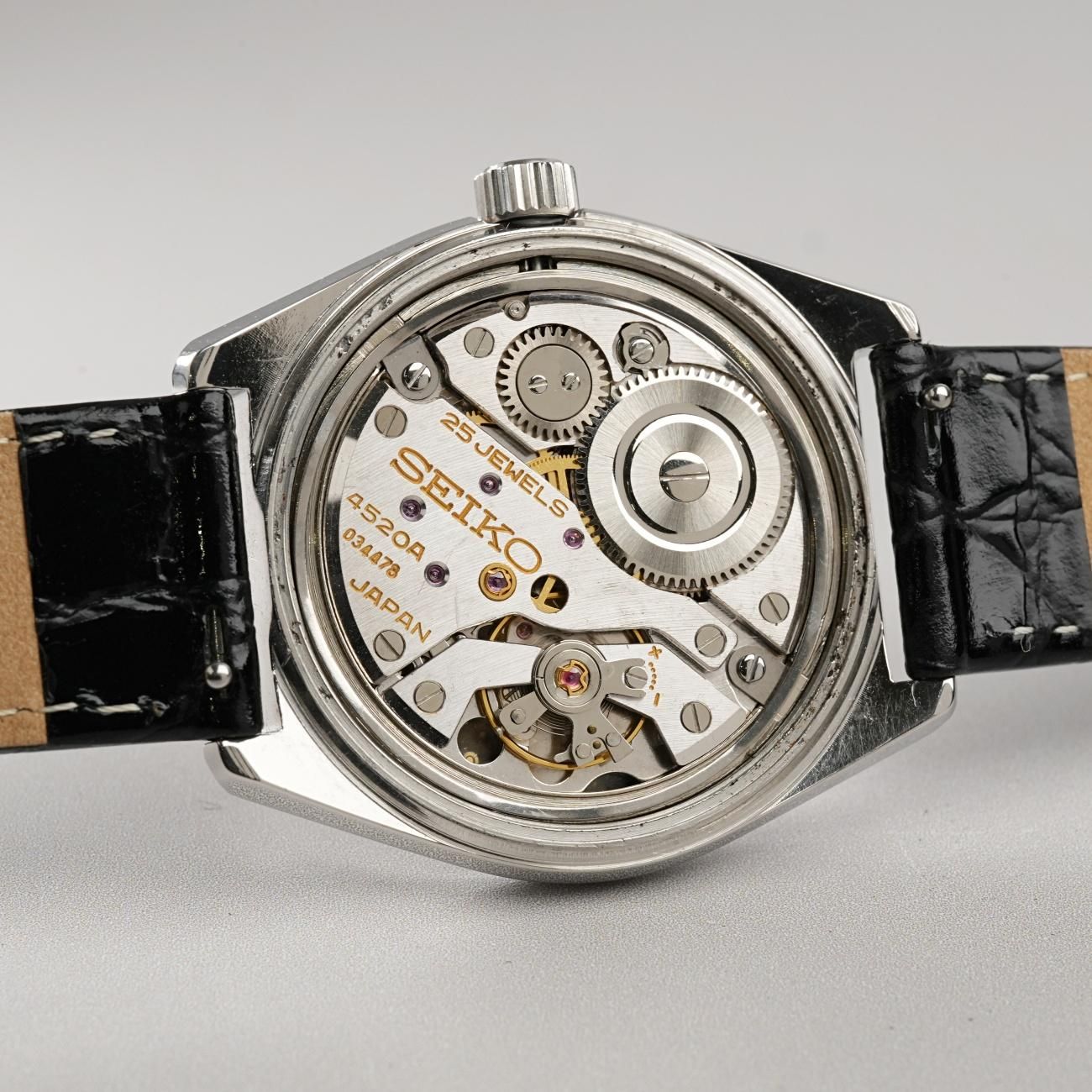「歴代セイコー機械式腕時計の最高傑作」と絶賛される、36000振動のハイビート手巻き25石ムーブメント、Cal.4520Aを搭載。
